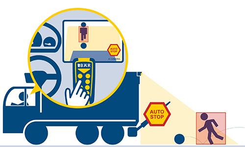 How about the platform stopping automatically if there is a risk of collision? The new VisionAssist assistance system uses AI rear-view cameras. If the camera detects a person within the platform's movement radius, the operating command immediately stops automatically - regardless of the control element used. The hazardous situation is directly displayed to the driver on the monitor in the cab. At the Bär Control EVO operating unit, the detected danger can be signaled with the red LED status display.